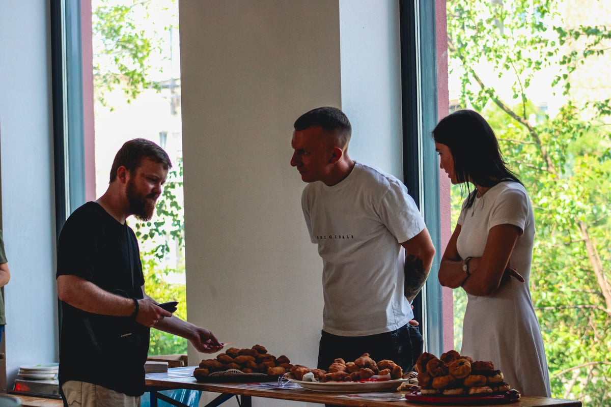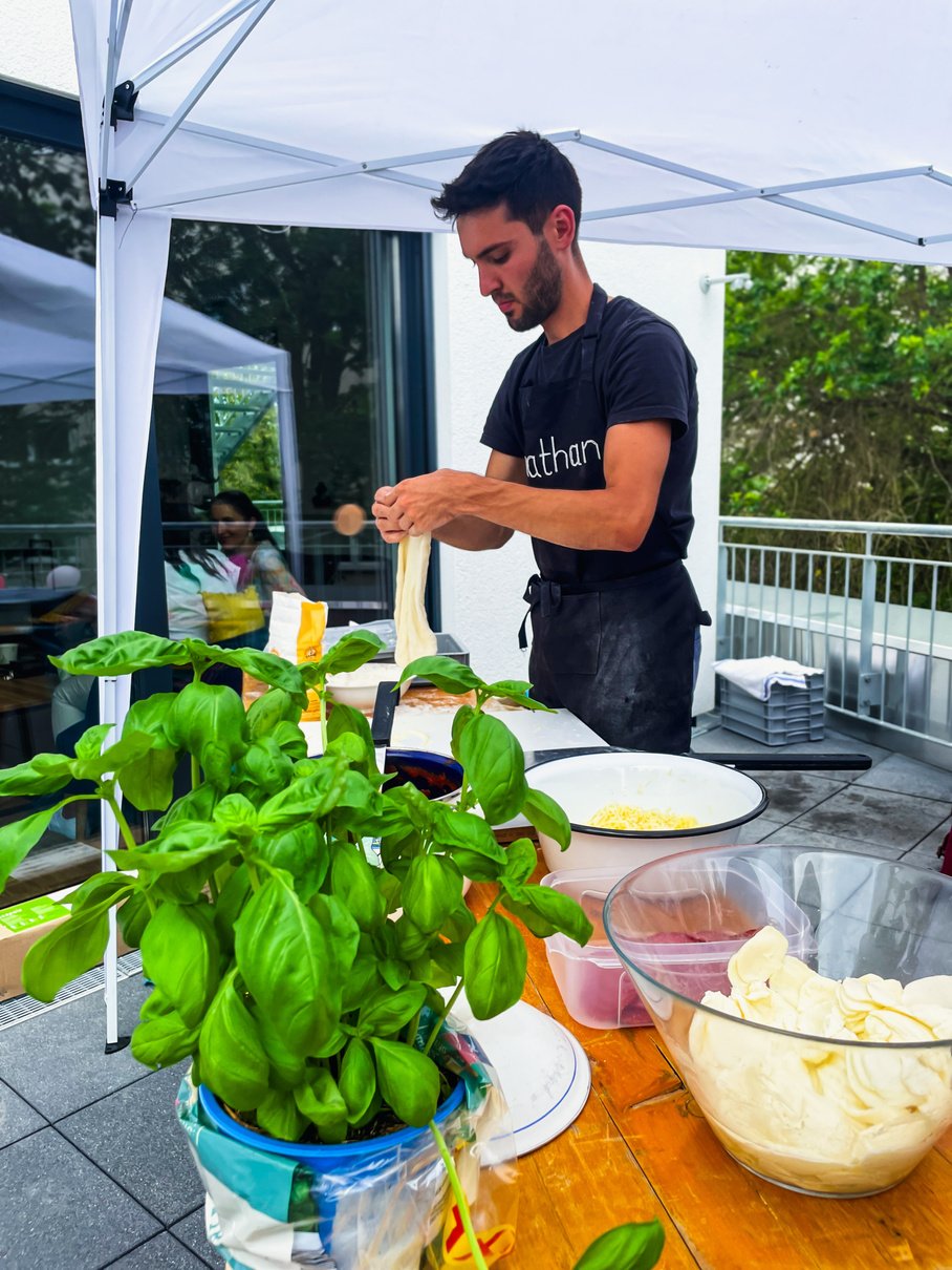 Links: Pizza bei der Einweihung